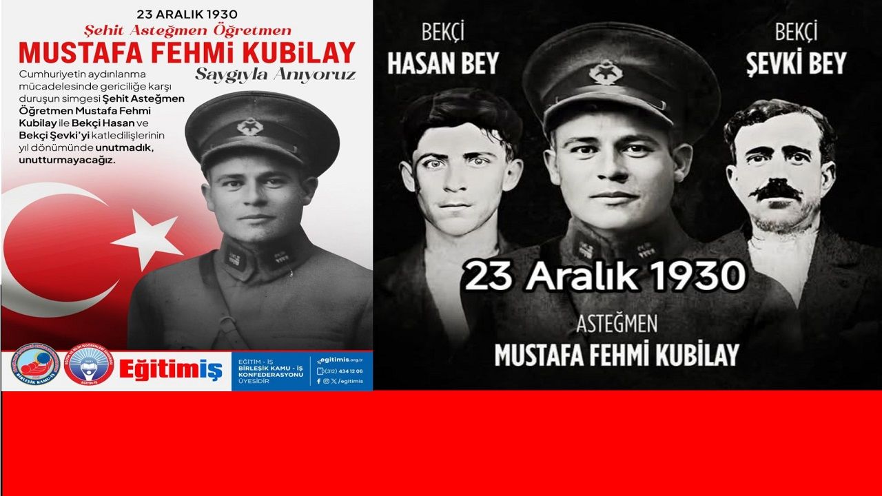 Asteğmen Mustafa Fehmi Kubilay ve iki bekçinin laiklik karşıtlarınca katledilişinin 95 yılı nedeni ile bir basın bildirisi yayımlayan Birleşik Kamu-İş Konfederasyonu ve Eğitim-İş Sinop Şube Başkanı Celal Şahbenderoğlu "23 Aralık 1930’da Menemen’de Asteğmen Öğretmen Mustafa Fehmi Kubilay ile Bekçi Hasan ve Bekçi Şevki’nin katledilmesi, genç Cumhuriyetimizin aydınlanmacı ve laik temellerine yönelik gerici bir başkaldırıdır." dedi.