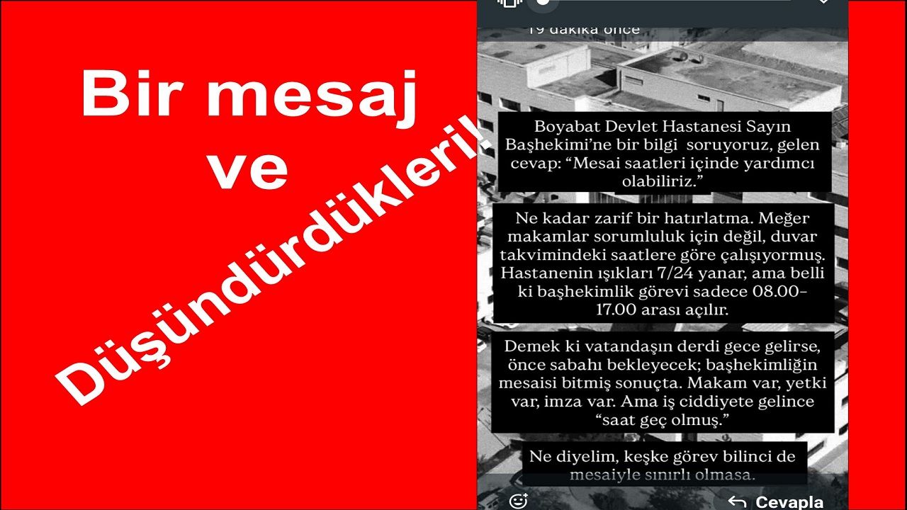 Boyabat'tan ulaşan bir mesaj bizi düşündürdü. Belli ki, sıkıntı var. Üstelik mesaj öyle bir yere atıldı ki, saniyesinde Vali, sağlık müdürü haberdar olur. Ya da biz öyle sanıyoruz! Öyle ya, "mesai ise sorun", mesai her yerde herkes için aynı. Bize düşen yalnızca bir öneri; Siz siz olun Boyabat'ta mesai saatleri dışında Başhekime ulaşmak zorunda kalacağınız ciddi sorun yaşamayın. Mesaiyi bekleyin!